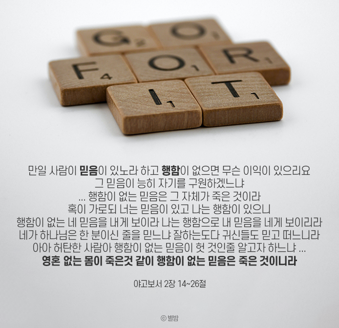 하나님을 믿는 것이란 무엇일까? 성경은 행함이 없는 믿음은 '죽음 믿음'이라 알려주고 있다. 그저 입술로만 마음으로만 하나님을 믿는다 하여 하나님을 믿는 것으로 인정하지 않는다는 뜻이다. 그렇다면 우리가 하나님을 믿는 것을 어떻게 구별하고 계실까?