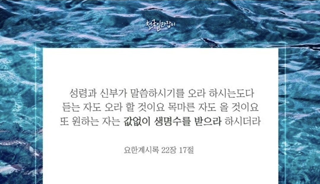 우리가 즐거워하고 크게 기뻐하여 그에게 영광을 돌리세 어린 양의 혼인 기약이 이르렀고 그 아내가 예비하였으니 천사가 내게 말하기를 기록하라 어린 양의 혼인 잔치에 청함을 입은 자들이 복이 있도다 하고 또 내게 말하되 이것은 하나님의 참되신 말씀이라 하기로 (요한계시록 19:6~8)