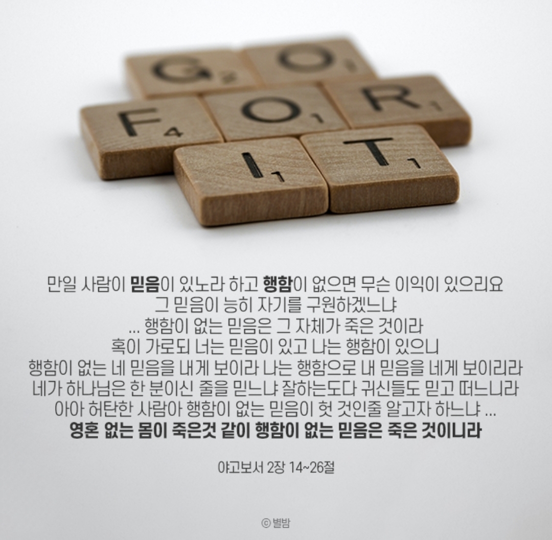 하나님을 믿는 것에 반드시 믿음이 있어야 합니다. 믿음이 없이는 아무것도 행할 수 없기 때문입니다. 믿음이 있을 때 하나님께서 명하신 규례도 잘 지킬 수 있고, 하나님께서 주신 모든 말씀과 가르침을 따를 수 있습니다. 그래서 성경은 믿음에 대해 정의하기를 "행함이 있어야 믿음이 있는 것"으로 인정하셨습니다.